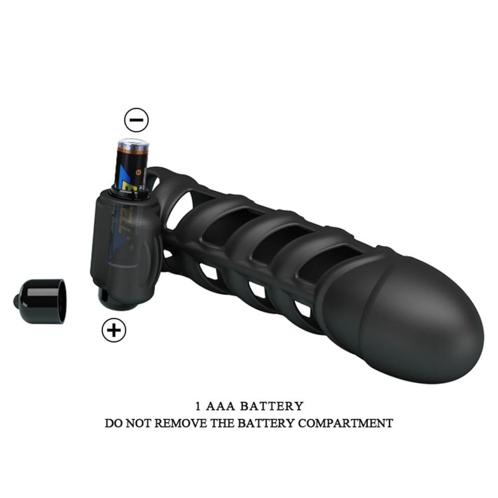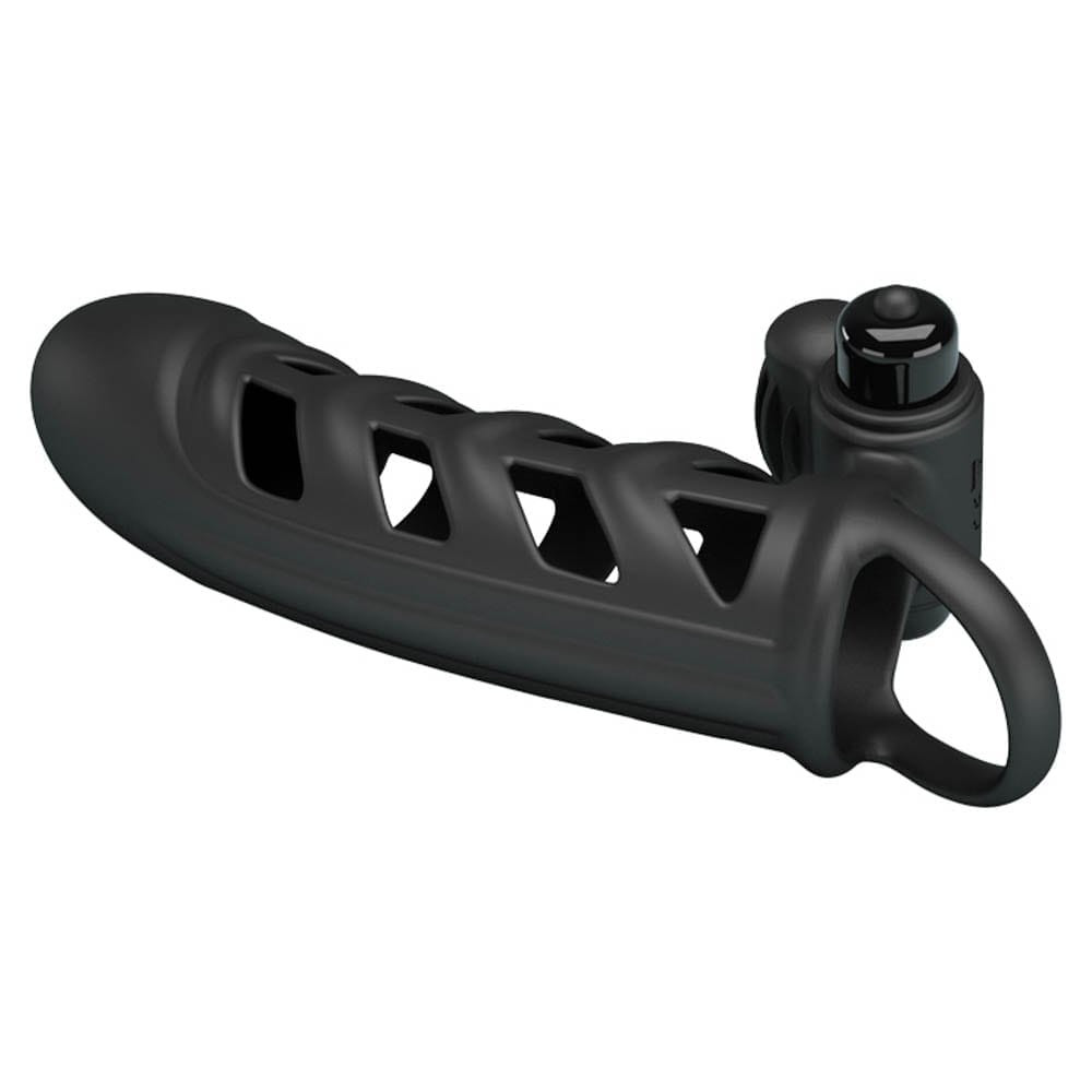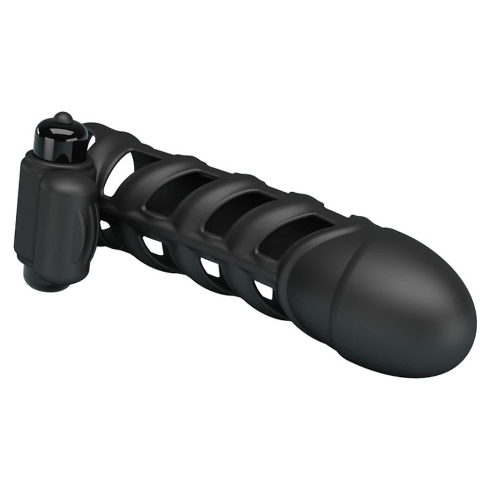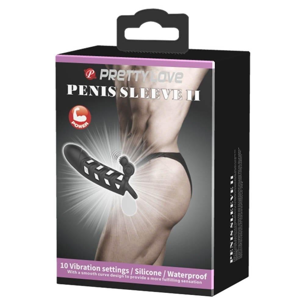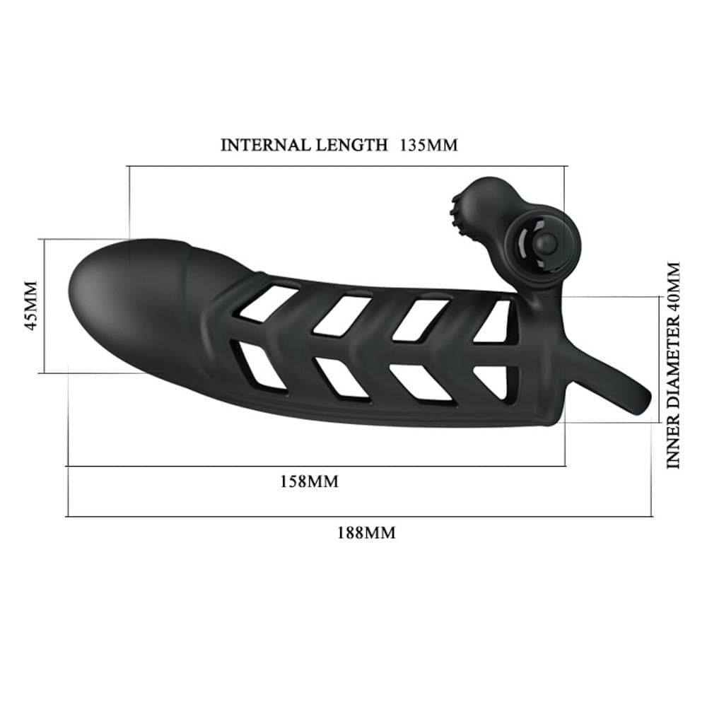 A penis sheath with a clitoral stimulator that covers the entire penis, can be applied in a condom-like manner, has 10 vibration levels, and is complemented by a clitoral stimulator. Its external design is exciting for the partner.