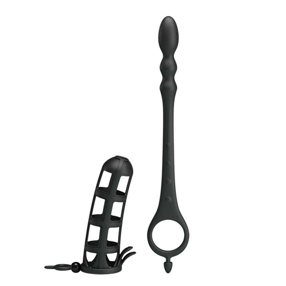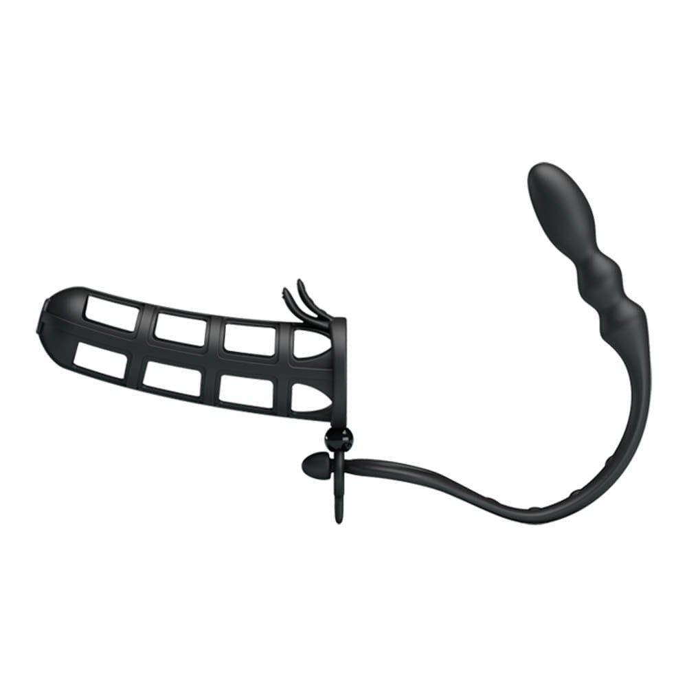 An erotic accessory that covers the entire penis or vibrator, can be applied in a condom-like manner, equipped with a clitoral stimulator. Its external design is exciting for the partner. The thickness of its material reduces the perception of stimuli, thus making it possible to prolong the time of intercourse. An anal stimulator can also be attached to the gown.