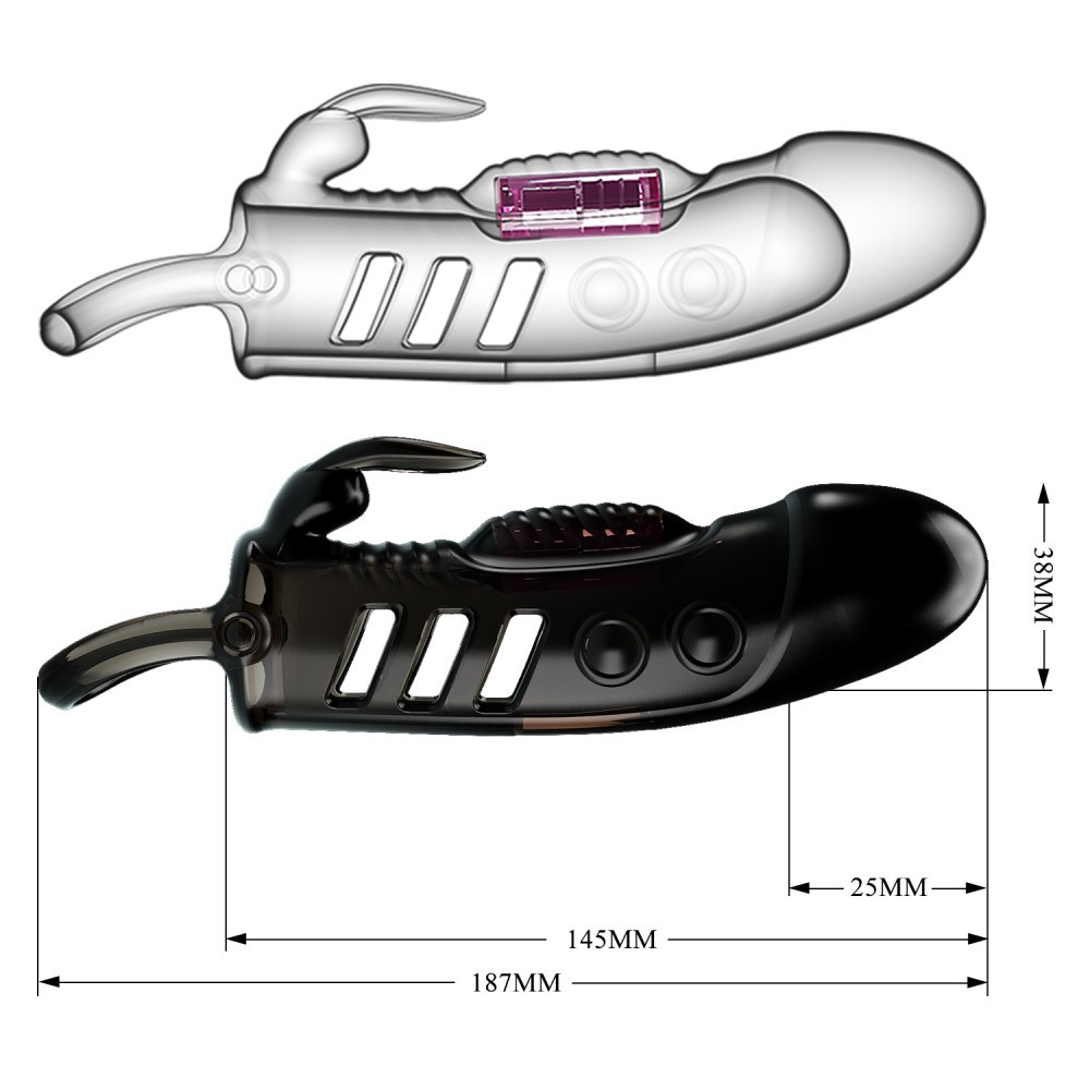Can be applied in a condom-like manner that covers the entire penis, Erotic accessory with vibrator, clitoral stimulator. External design of the partner for him. The thickness of its material reduces the perception of stimuli, so allows for the extension of the duration of the act. Vibrator on tip lengthens the length of the penis and is activated on contact.