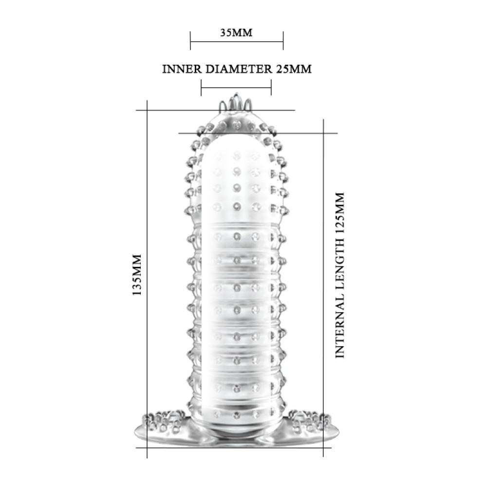 Condom-like penis or vibrator covering the entire penis or vibrator erotic accessory that can be placed in a different way. External design for the partner It has an irritating effect. The thickness of its material reduces the perception of stimuli, so it does allows the time of the act to be extended.