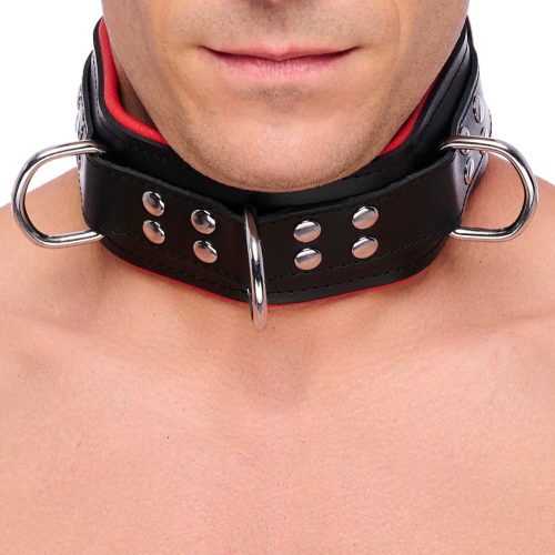 Párnázott bőr nyakörv 3 D-gyűrűvel – piros