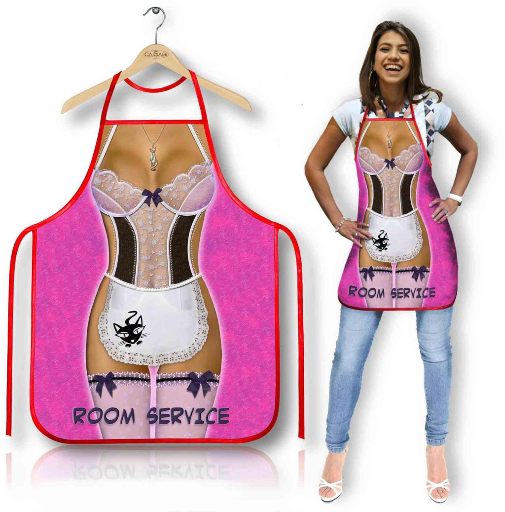 Ébredj játékos szenvedélyre ezzel az érzéki „Room Service” mintás konyhai köténykel! Prémium minőségű, könnyen tisztítható anyaga és csábító dizájnja garantáltan feldobja a főzést és a hangulatot. Tökéletes ajándék különleges estékhez, amikor a játékos flörtölés veszi át a vezetést!