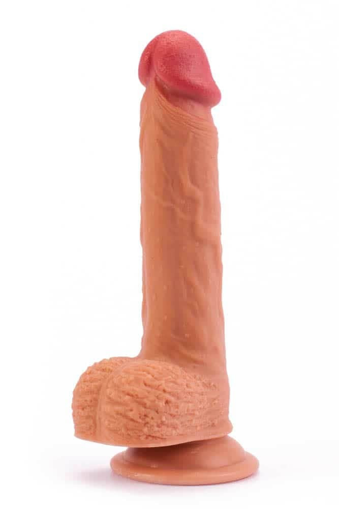 A penis-shaped, bendable with a soft outer layer and a hard inner core, made of a leather-like material similar to body tissue, without a motor, with a veined surface, complete with testicles. It can be attached to a flat surface with the help of its suction cup.