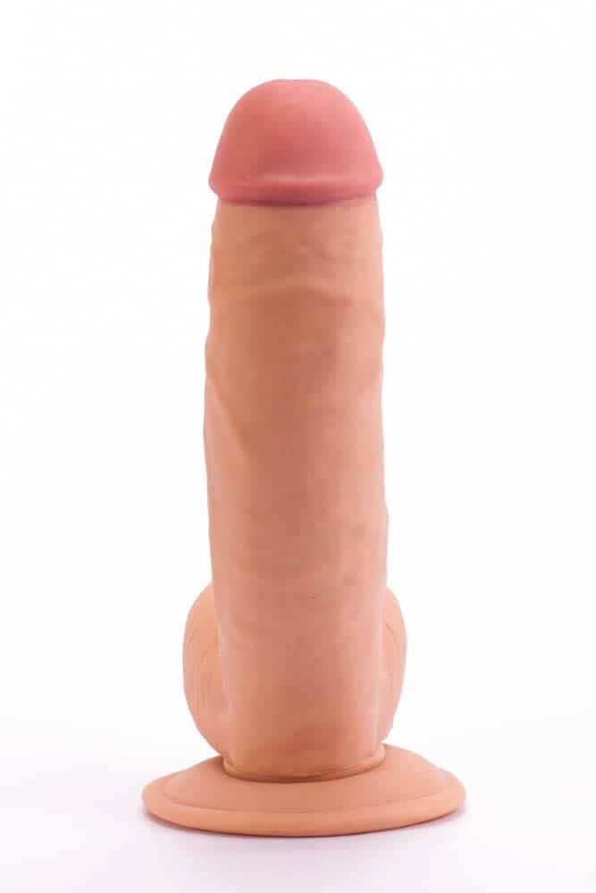 A soft, flexible made of a soft, flexible material with a soft outer layer and a hard inner core, similar to body tissue, made of leather-like material without a motor, with a veined surface, complete with testicles. It can be attached to a flat surface with the help of its suction cup.