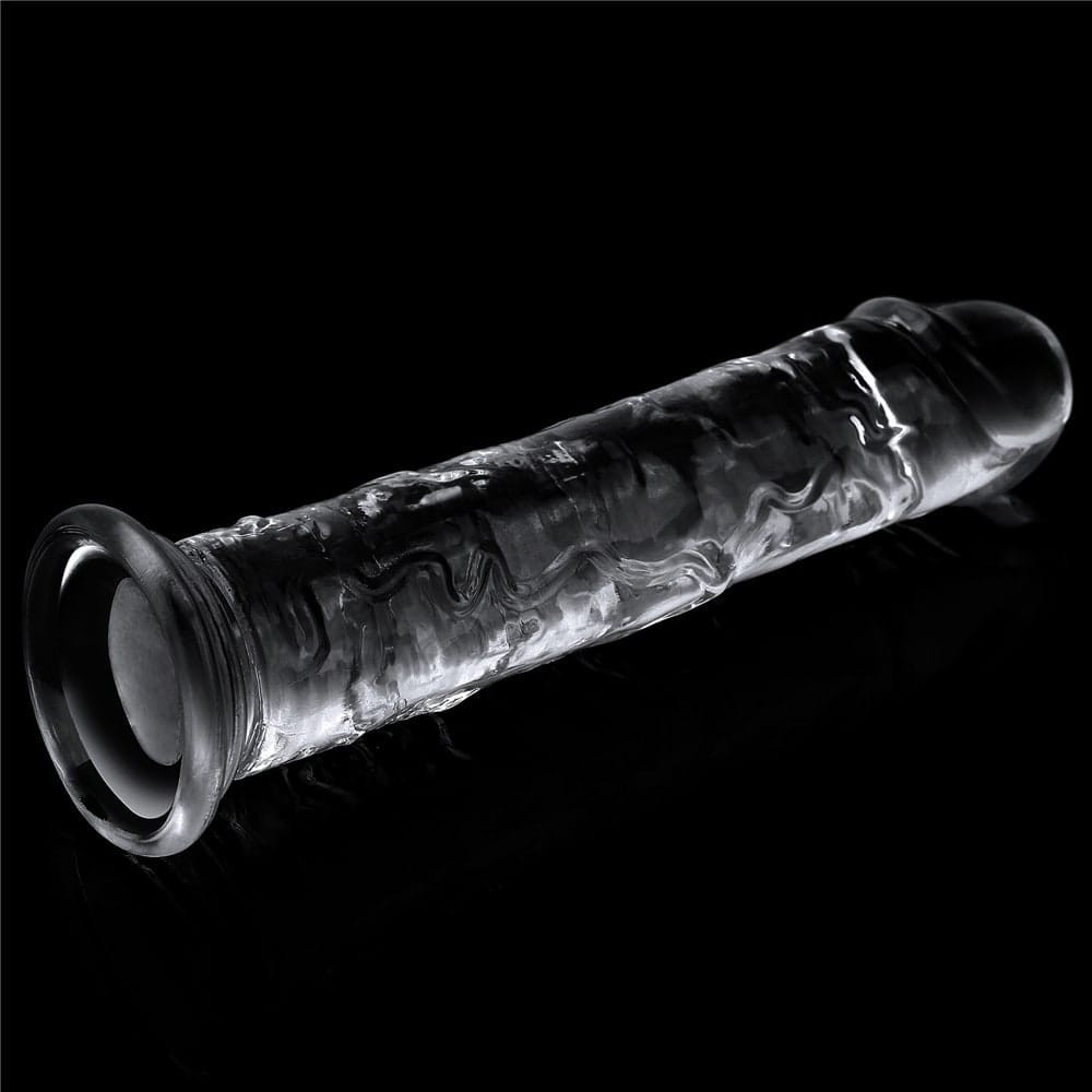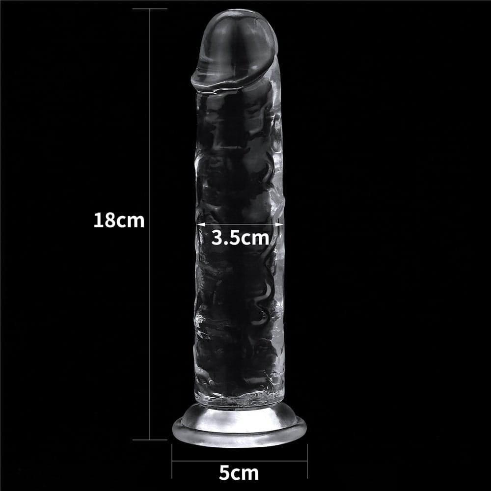 Flexible, transparent, penis-shaped, motorless, veined made of soft material. It can be attached to a flat surface with the help of its suction cup.