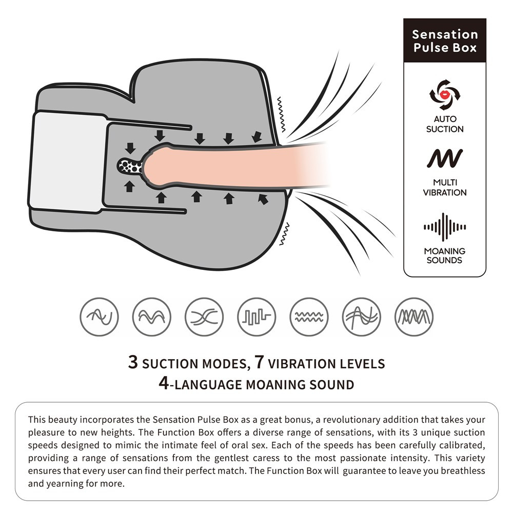 Made of high-quality leather-like material for men With recommended, realistically designed anus and vaginal openings Designed with 3 suction and 7 vibration functions, erotic during intercourse masturbator who makes sounds. Using self-control during intercourse It can be greatly improved, so its time can be significantly increased. The package It also includes a women's thong. English, Japanese, Korean, and Chinese languages for the audio . Product weight 2.52 kg.