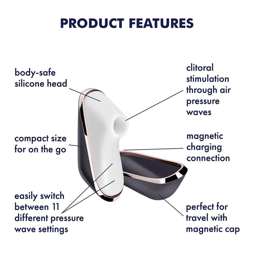 An airwave clitoral stimulator made of premium quality, skin-friendly material, easy to control, with 11 suction functions, which can be placed in a case that closes with a magnet, one half of which is the stimulator itself. As the name suggests, it can really be taken anywhere and anytime.